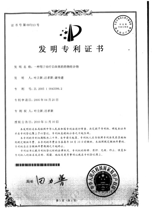 摘要:一种用于治疗白血病的药物组合物,采用天然中草药为配伍原料精制而成,其特征在于该药物组合物主要包括下列组分的药物原料和重量配比范围:红藤20.0~30.0,车前草5.00~10.0,洋金花0.3~0.5,川乌0.3~0.6,麝香0.05~0.1,白鸽屎3.0~5.0,酢酱草10.0~15.0。本发明运用中药相互协调的效能,由上述多味药物原料配伍复合组成,可很好发挥其协同治病作用,可用于治疗急、慢性白血病患者。与已有技术比较,具有药效组方配伍合理,疗效明显,能迅速促进骨髓造血功能,抑制白血球细胞异常增生,促进血液循环,增强机体免疫功能,根据多年来对部分患者的施药使用效果表明,其有效率可达70%以上,且极少有副作用。