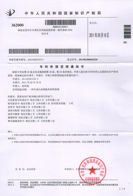 摘要: 本实用新型公开了一种生活污水回收再利用系统,包括蓄水池、洗漱池、洗菜池、马桶、连接管构成,其蓄水池有入水口、出水口和可视水位线的透明板,所述的入水口通过连接管连接到洗漱池和洗菜池,洗漱池和洗菜池连接管分两路,一路连接水闸再连接过滤球,最后直接接入蓄水池,入水口处连接浮球控制阀,另一路通过单向阀一直接排出外管;所述的出水口通过连接管连接水闸再连接三通管件,三通管件一端直接通向马桶,另一端连接单向阀二和水闸再与自来水管接通。本实用新型可将生活中用过的如洗澡,洗头,洗衣服用水,洗菜,洗碗,洗米等用水收集来冲洗马桶,可节省平时用来冲洗马桶用的洁净的水,其结构简单、成本低、易于实现。