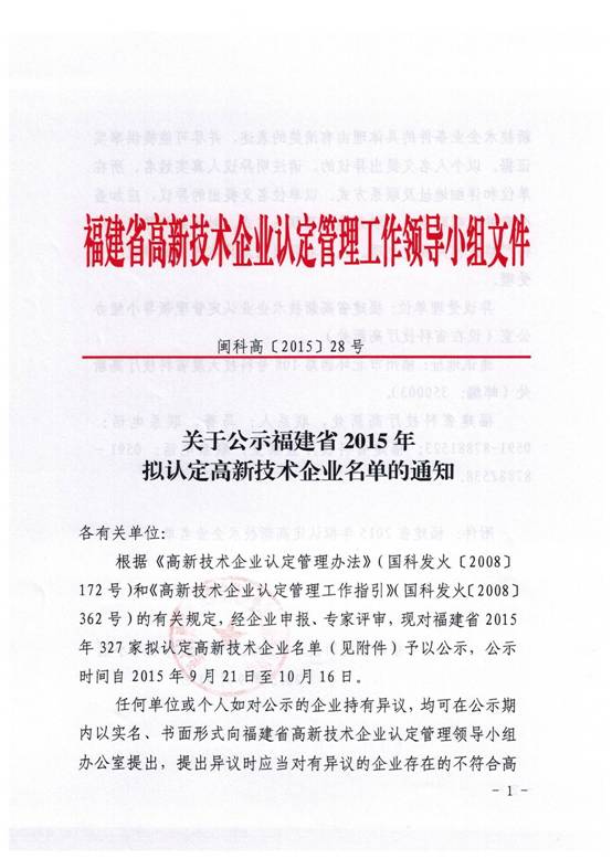 关于公示福建省2015年拟认定高新技术企业名单的通知
