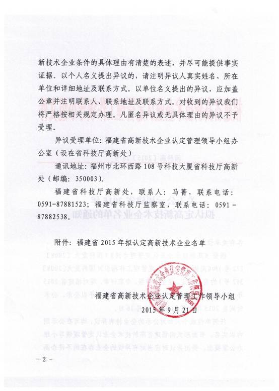 关于公示福建省2015年第二批拟更名高新技术企业的通知