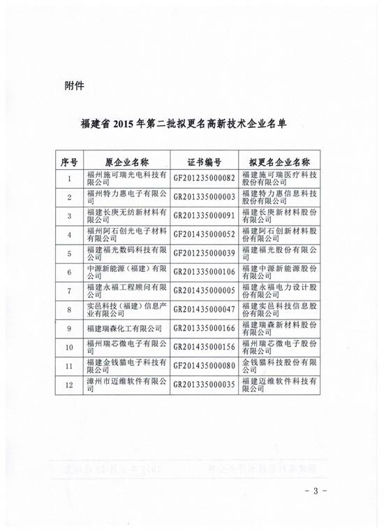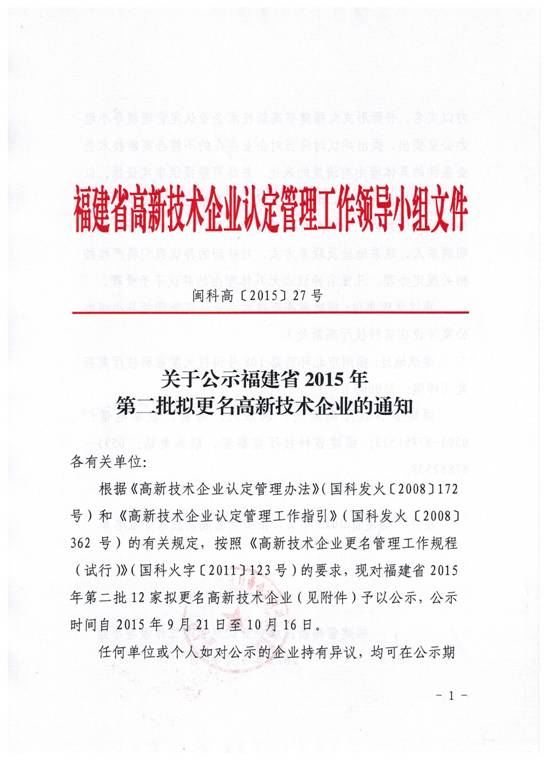 关于公示福建省2015年第二批拟更名高新技术企业的通知